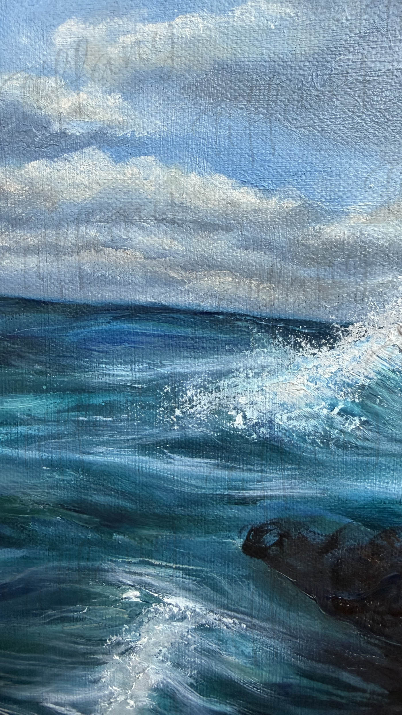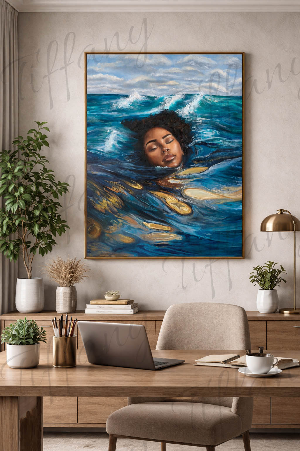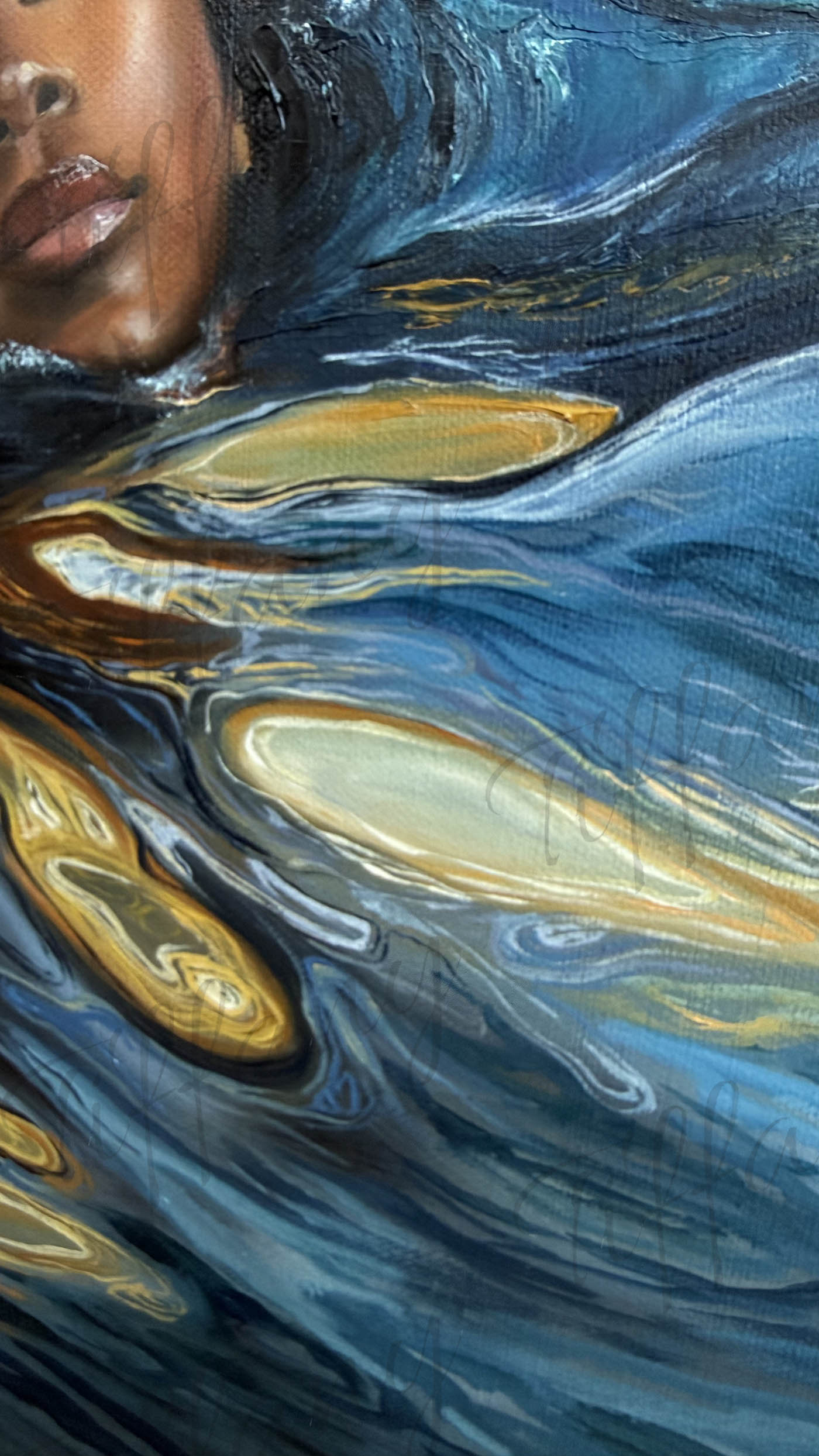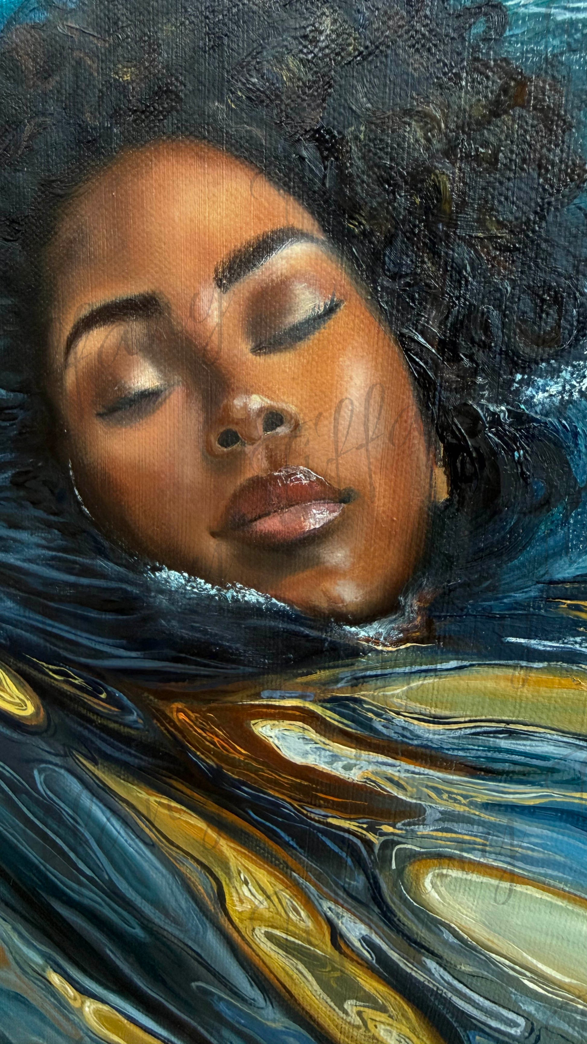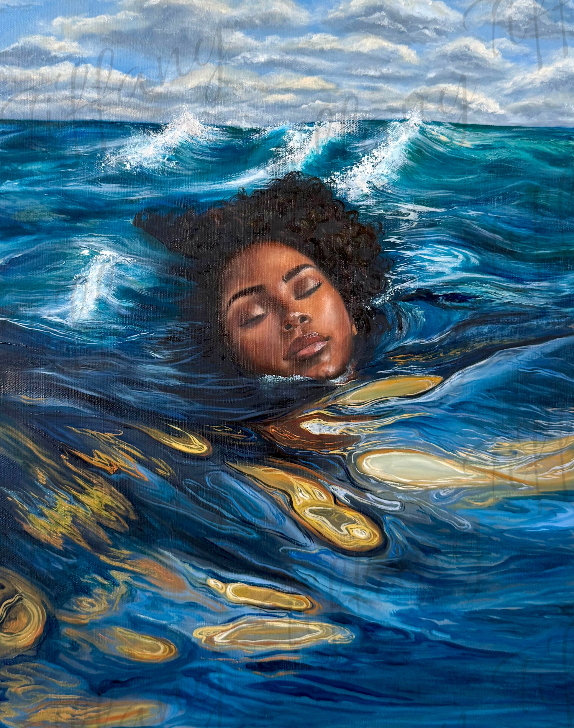 "Blue Mercy" is a powerful portrayal of peace in the midst of chaos. A woman floats calmly in turbulent waters. her eyes closed in quiet surrender as golden reflections ripple around her. The piece symbolizes faith, healing, and the unseen mercy that carries us through life's deepest trials. Even when the waves rage, there is a stillness that comes from trusting that we are not alone.